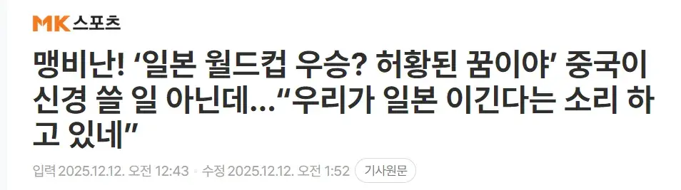 对此,韩国媒体方面也是给出了自己的看法,韩媒MK体育在12日指出,日本队在世界杯夺冠的可能性不大,这就如同中国队能够战胜日本队闯进世界杯一样不切实际,并且还称中国男足是屡战屡败却又毫无长进,另外韩媒也给出了日本队在本届世界杯上最实际的目标,他们认为日本队在世界杯中突破16强要更加现实一些。
