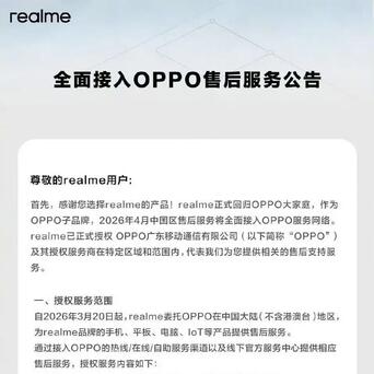 3 月 20 日,OPPO 官方发布消息称,realme 即日起接入 OPPO 官方售后网络服务。据悉,3 月 20 日到 3 月 31 日为用户过渡期,4 月 1 日起 realme 手机、平板、电脑、IoT 等全品类产品,都将由 OPPO 服务网络提供售后支持。